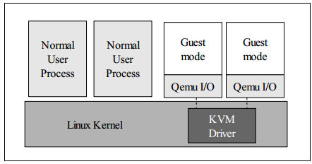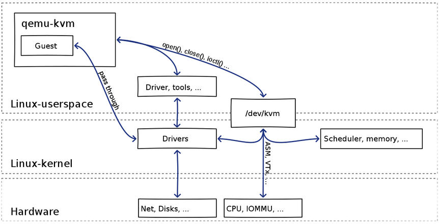 - 原生的 QEMU 通过指令翻译实现 CPU 的完全虚拟化,但是修改后的 QEMU-KVM 会调用 IOCTL 命令来调用 KVM 模块。