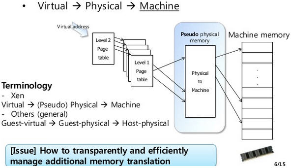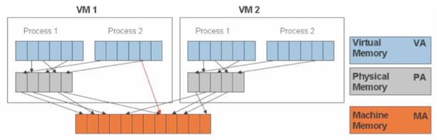 除了 CPU 虚拟化,另一个关键是内存虚拟化,通过内存虚拟化共享物理系统内存,动态分配给虚拟机。虚拟机的内存虚拟化很象现在的操作系统支持的虚拟内存方式,应用程序看到邻近的内存地址空间,这个地址空间无需和下面的物理机器内存直接对应,操作系统保持着虚拟页到物理页的映射。现在所有的x86 CPU都包括了一个称为内存管理的模块MMU(Memory Management Unit)和 TLB(Translation Lookaside Buffer),通过MMU和TLB来优化虚拟内存的性能。