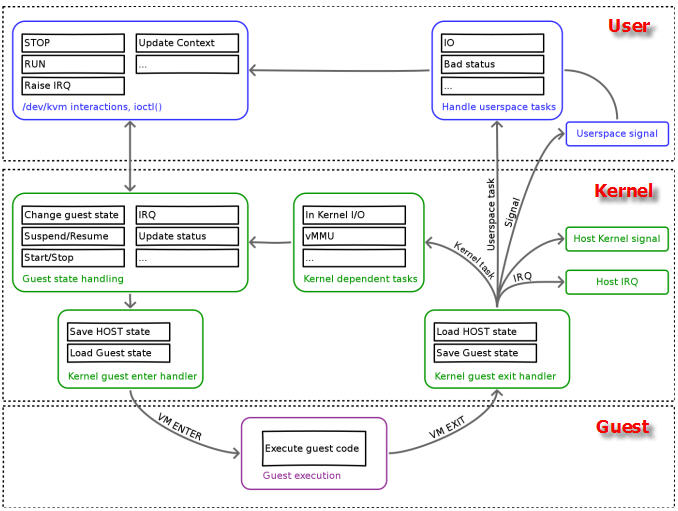 - Kernel 模式:负责将CPU切换到Guest mode 执行Guest OS代码,并在CPU退出 Guest mode 时回到 Kenerl 模式