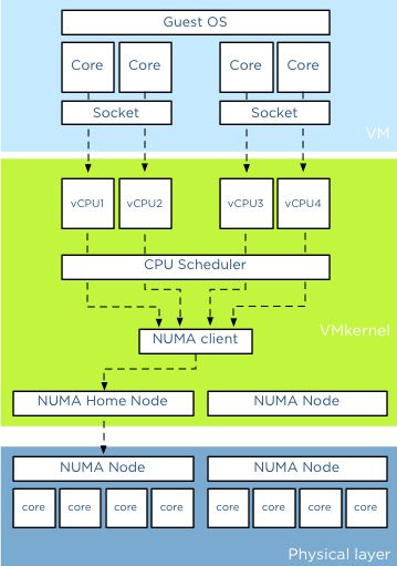 这篇文章 是关于 vSphere 中 CPU 虚拟化的,我觉得它和 KVM CPU虚拟化在很大程度上是一致的。下图是使用 2 socket 2 core 共 4 个 vCPU 的情形: