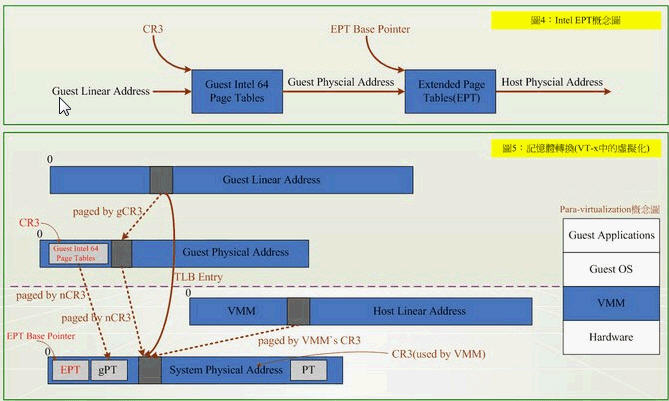 EPT的好处是,它的两阶段记忆体转换,特点就是将 Guest Physical Address → System Physical Address,VMM不用再保留一份SPT (Shadow Page Table),以及以往还得经过SPT这个转换过程。除了降低各部虚拟机器在切换时所造成的效能损耗外,硬体指令集也比虚拟化软体处理来得可靠与稳定。