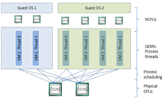 vCPU、QEMU 进程、LInux 进程调度和物理CPU之间的逻辑关系: