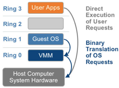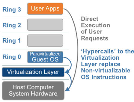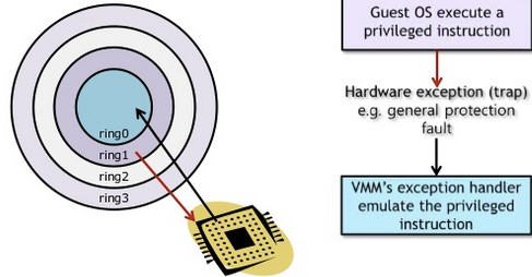 客户操作系统运行在 Ring 1,它在执行特权指令时,会触发异常(CPU的机制,没权限的指令会触发异常),然后 VMM 捕获这个异常,在异常里面做翻译,模拟,最后返回到客户操作系统内,客户操作系统认为自己的特权指令工作正常,继续运行。但是这个性能损耗,就非常的大,简单的一条指令,执行完,了事,现在却要通过复杂的异常处理过程。