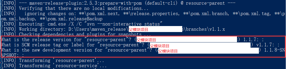 “主干上新的版本是什么?默认为1.1.8-SNAPSHOT。” 哈,release插件会自动帮我更新版本到1.1-SNAPSHOT,很好,直接回车。