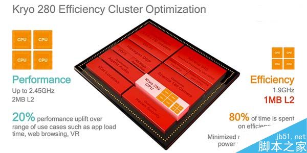 大家最关心的CPU规格方面,骁龙835启用的Kryo 280核心,Big 4+Little 4总计八核心设计。前者主频提升到2.45GHz,二缓2MB,后者提升到1.9GHz,二缓1MB。按照高通的说法,应用载入、网页浏览、VR等会调用大核,另外80%的时间都是小核在工作。