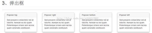 <h1 class="page-header">3、弹出框</h1> <div class="bs-example bs-example-popover"> <div class="popover top"> <div class="arrow"></div> <h3 class="popover-title">Popover top</h3> <div class="popover-content"> <p>Sed posuere consectetur est at lobortis. Aenean eu leo quam. Pellentesque ornare sem lacinia quam venenatis vestibulum.</p> </div> </div> <div class="popover right"> <div class="arrow"></div> <h3 class="popover-title">Popover right</h3> <div class="popover-content"> <p>Sed posuere consectetur est at lobortis. Aenean eu leo quam. Pellentesque ornare sem lacinia quam venenatis vestibulum.</p> </div> </div> <div class="popover bottom"> <div class="arrow"></div> <h3 class="popover-title">Popover bottom</h3> <div class="popover-content"> <p>Sed posuere consectetur est at lobortis. Aenean eu leo quam. Pellentesque ornare sem lacinia quam venenatis vestibulum.</p> </div> </div> <div class="popover left"> <div class="arrow"></div> <h3 class="popover-title">Popover left</h3> <div class="popover-content"> <p>Sed posuere consectetur est at lobortis. Aenean eu leo quam. Pellentesque ornare sem lacinia quam venenatis vestibulum.</p> </div> </div> </div>
