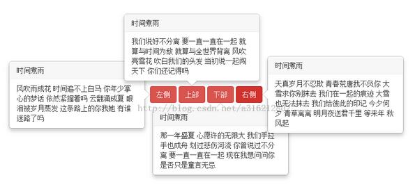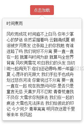 <a href="javascript:void(0)" id="a_pop" class="btn btn-danger" data-placement="bottom" data-content=" 风吹雨成花 时间追不上白马 你年少掌心的梦话 依然紧握着吗 云翻涌成夏 眼泪被岁月蒸发 这条路上的你我她 有谁迷路了吗 我们说好不分离 要一直一直在一起 就算与时间为敌 就算与全世界背离 风吹亮雪花 吹白我们的头发 当初说一起闯天下 你们还记得吗 那一年盛夏 心愿许的无限大 我们手拉手也成舟 划过悲伤河流 你曾说过不分离 要一直一直在一起 现在我想问问你 是否只是童言无忌 天真岁月不忍欺 青春荒唐我不负你 大雪求你别抹去 我们在一起的痕迹 大雪也无法抹去 我们给彼此的印记 今夕何夕 青草离离 明月夜送君千里 等来年 秋风起" data-original-title="时间煮雨" >点击加载</a>