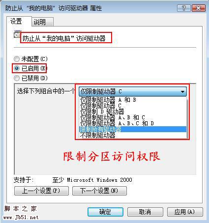 第三步:我们选择“已启用”后,在下面就会出现选择驱动器的下沉列表,如果希望限制某个驱动器的使用,只要选中该驱动器就可以了。比如,我们要限制C盘的使用,选中“仅限制驱动器C”,就可以了。如果希望关闭所有的驱动器,包括光驱等,可以选中“限制所有驱动器”。(图1)