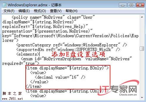 前者是用来限制访问分区,后者则是用来隐藏分区,例如这里还是以E分区为例进行说明,请在两处位置分别添加如下代码,这里的“16”表示E分区的十进制代码: (图4)