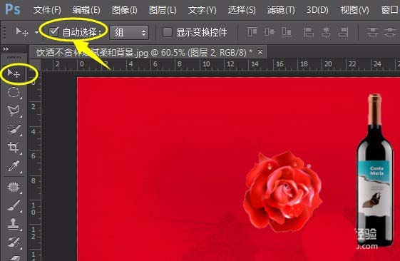 3、单击选“移动工具”选项栏中“自动选择”前打√,方便选择图片。按Alt键复制几个酒的图片,并调整好图层顺序。如图: