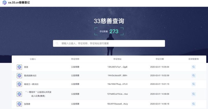 最早的案例是1月25日(正月初一),杭州复杂美科技发起的33区块链慈善平台。截稿时,该平台目前已经开发完成并落地,并累计登记存证信息273条,囊括企业、名人及社会各界爱心认识的慈善捐赠信息,及医护志愿者的医疗志愿信息等。