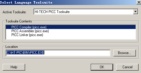 在Active Toolsuite下拉列表框中选择HI-TECH PICC Toolsuite作为开发工具组件,然后在Toolsuite Contents列表框中选择PICCCompiler项,如下图所示。