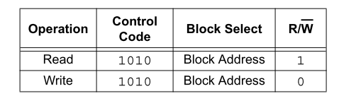 EEPROM 的设备地址可以在 24LC04 的芯片手册上找的到,高 4 位是 A,后面 3 位是 Block地址,因为 24LC04 只有 2 个 Block, 所以高 2 位 Block Address 是无效的。