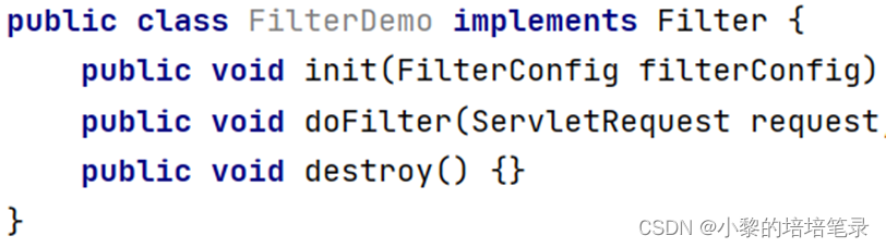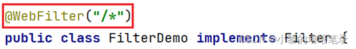 2、配置Filter拦截资源的路径:在类上定义 `@WebFilter` 注解。而注解的 `value` 属性值 `/*` 表示拦截所有的资源