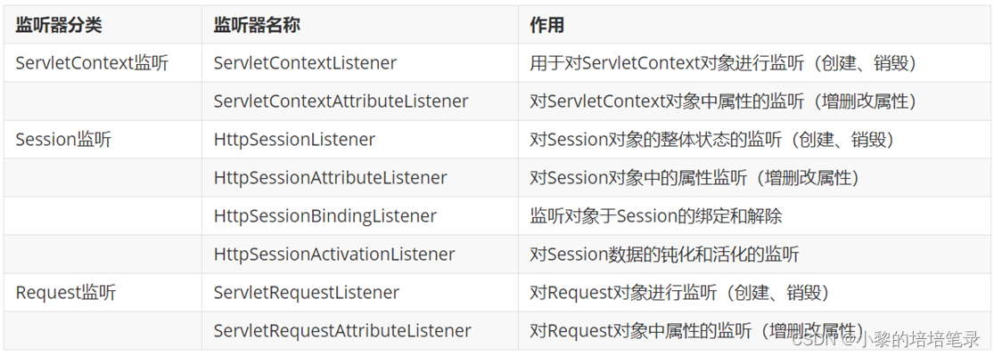 1、Listener 表示监听器,是 JavaWeb 三大组件(Servlet、Filter、Listener)之一。