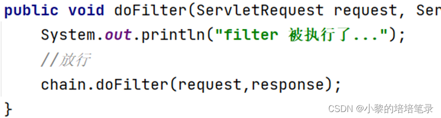 上述代码中的 `chain.doFilter(request,response);` 就是放行,也就是让其访问本该访问的资源。