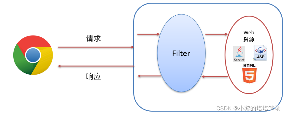 而在访问到这些资源之前可以使过滤器拦截来下,也就是说在访问资源之前会先经过Filter,如下图: