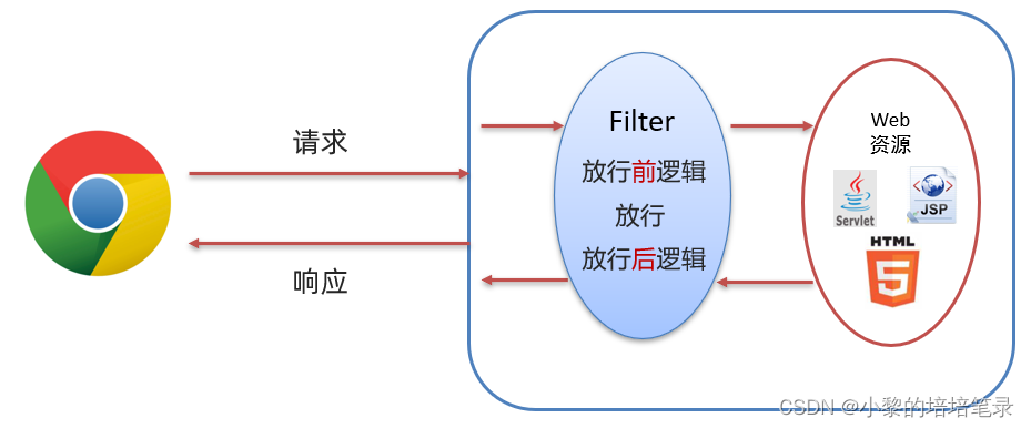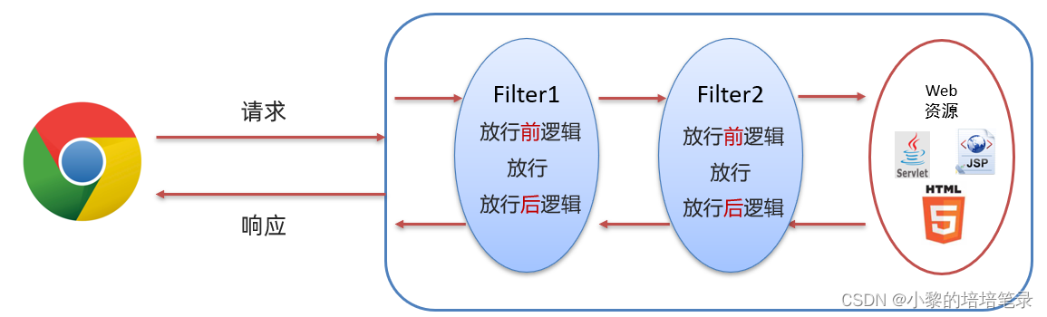 以后我们可以将对请求进行处理的代码放在放行之前进行处理,而如果请求完资源后还要对响应的数据进行处理时可以在放行后进行逻辑处理。