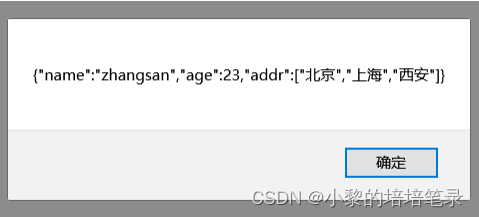 <!DOCTYPE html> <html lang="en"> <head> <meta charset="UTF-8"> <title>Title</title> </head> <body> <script> //1. 定义JSON字符串 var jsonStr = '{"name":"zhangsan","age":23,"addr":["北京","上海","西安"]}' alert(jsonStr); </script> </body> </html>通过浏览器打开,页面效果如下图所示