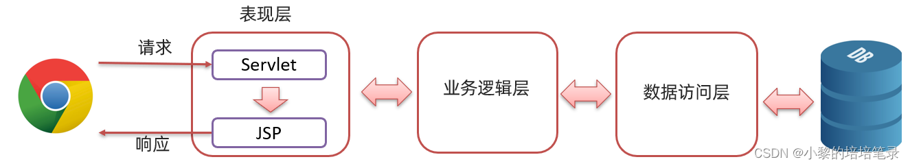 如上图,`Servlet` 调用完业务逻辑层后将数据存储到域对象中,然后跳转到指定的 `jsp` 页面,在页面上使用 `EL表达式` 和 `JSTL` 标签库进行数据的展示。