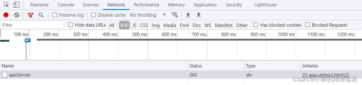 这个是查看所有的请求,如果我们只是想看 异步请求的话,点击上图中 `All` 旁边的 `XHR`,会发现只展示 Type 是 `xhr` 的请求。如下图: