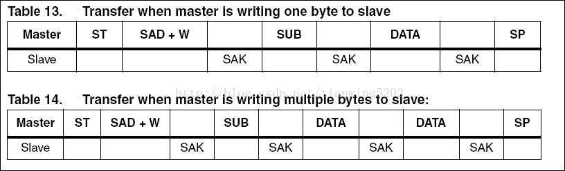 8. 读写操作都是首先 Master 发 ST 信号,然后发 SAD+W(要读/写的Slave地址和读操作),此时为SAD的Slave回应 SAK信号,Master只有收到这个信号之后,才能继续完成读写操作。