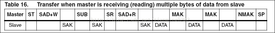 10. 读操作相比写操作麻烦一些,它需要先做一个写动作,然后再读。 接7,Master发送DATA数据(通知Slave我要读啥),Slave回应SAK,Master发送SR信号(重复Start信号),然后发送SAD+R信号(读操作),Slave回应SAK,slave发送DATA,Master回应 MAK 信号,对于Slave发送的每个DATA,Master都必须应答MAK信号,并且最后一个DATA信号NMAK(因为是最后一个了Master无需应答),然后发送SP信号释放I2C线。