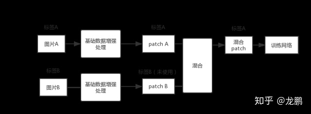 SamplePairing方法的处理流程如下图所示,从训练集中随机抽取两张图片分别经过基础数据增强操作(如随机翻转等)处理后经像素取平均值的形式叠加合成一个新的样本,标签为原样本标签中的一种。