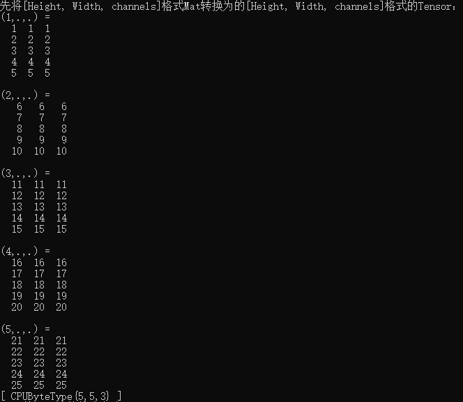cout << "先将[Height, Width, channels]格式Mat转换为的[Height, Width, channels]格式的Tensor:" << endl;