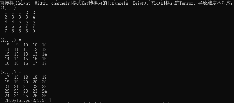cout << "直接将[Height, Width, channels]格式Mat转换为的[channels, Height, Width]格式的Tensor,维度不对应:" << endl;
