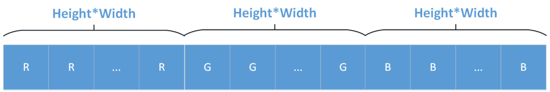 神经网络的输入通常为一张单通道灰度图或一张三通道的彩色图,如果输入为Opencv Mat格式的三通道彩色图,我们需要格外注意数据维度的顺序,因为Mat格式的三通道图像与libtorch Tensor张量的数据维度是不一样的,前者是[Height, Width, channels],后者是[channels, Height, Width],如果展开成一维向量来看,Opencv Mat存储RGB图像的顺序为(每个R、G、B像素点交替存储):