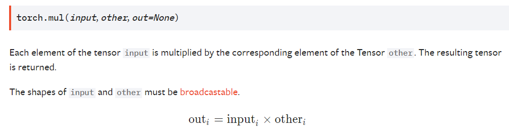 疑惑是,之前看的csdn博客,都说过pytorch的矩阵点乘需要两个矩阵的维度相同,然而a_2和b_2为何维度不同也能相乘呢?因此去查询pytorch的官方文档。即查看torch.mul的文档https://pytorch.org/docs/stable/torch.html?highlight=mul#torch.mul,可见