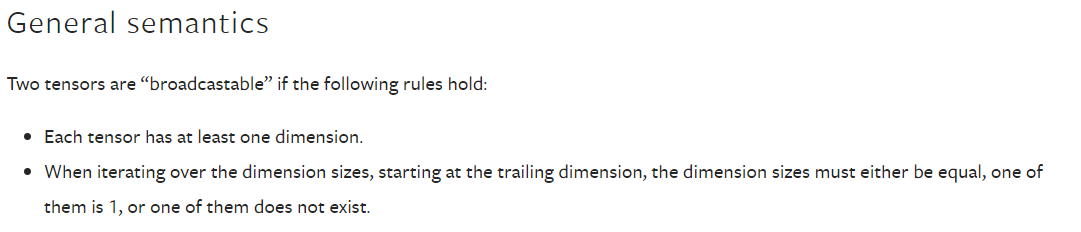- 当迭代尺寸时,从尾部尺寸开始,尺寸必须相等,或者其中一个尺寸为1,或者尺寸不存在。