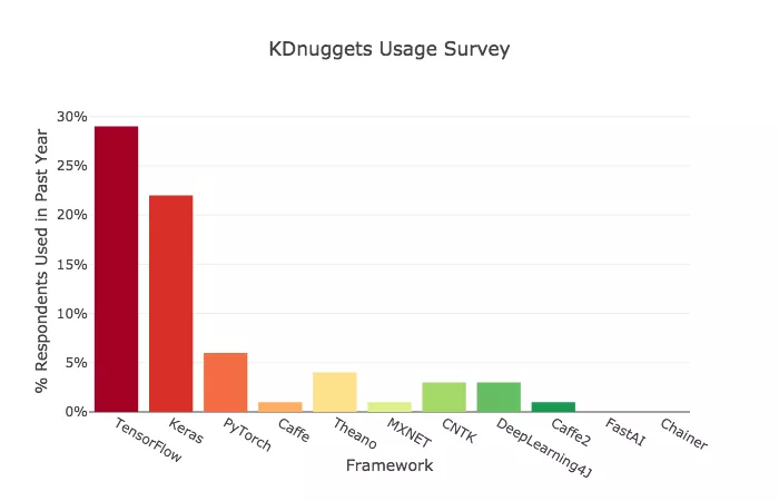 TensorFlow经过四年的发展,逐渐成为深度学习与机器学习框架的霸主,市场占有率与用户都遥遥领先于其他竞争对手。下图为下图是KDnuggets网站对2018年的机器学习框架的使用做的一个调查统计。可以可以看出当时TensorFlow已经遥遥领先于其他竞争(Keras 是一个上层封装,底层调用的还是 TensorFlow),奠定了其深度学习霸主的地位。