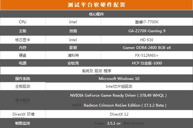 为保证测试能够发挥显卡的最佳性能,本次测试平台采用全新7代酷睿芯——Intel酷睿i7-7700K处理器、技嘉Z270芯片组主板、影驰 Gamer DDR4-2400 8GB 四通道内存、安钛克1000w钛金电源组建而成。详细硬件规格如下表所示: