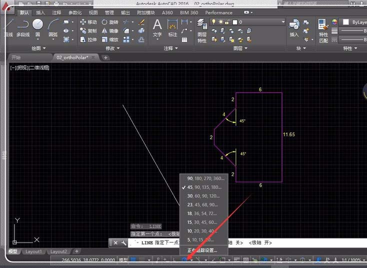 5、极轴追踪命令F10,打开小图标可以选不同角度