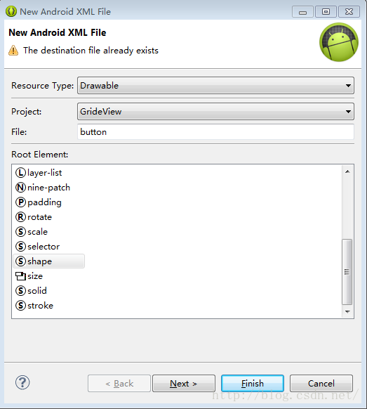 2、在drawable 文件夹中新建一个xml文件,右键->NEW->Android XML File ,取名button,Root Element选择shape,