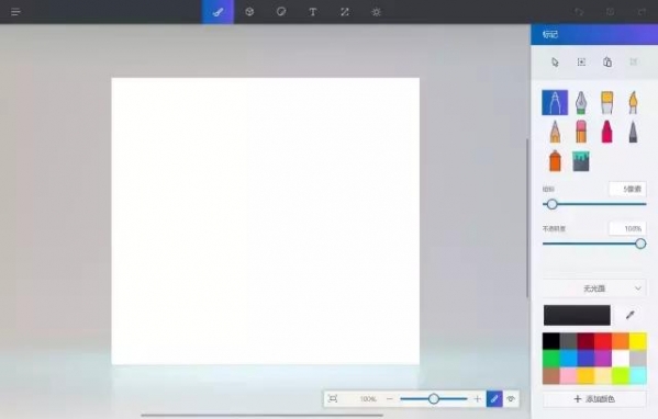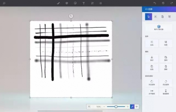顶部几个板块包括绘画、三维、贴纸、文字等;右边是具体的工具、颜色、参数等调节。主界面是一块白板,仔细看的话,它是处在一个三维空间中的,这也是这个软件的特色,形象来说就是在空间中绘画。