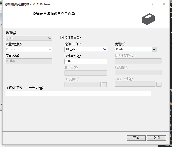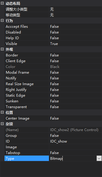 图里没见过的那个小仙人掌的图标就是我们今天要用的图片Bitmap控件,选择左侧工具栏里的Picture Control拖动到右侧,再在属性里把Type改成本文要用的Bitmap,并讲名字重命名为IDC_show(因为默认的是Static在添加显示图片变量时会出问题,所以这里必须要改!!)