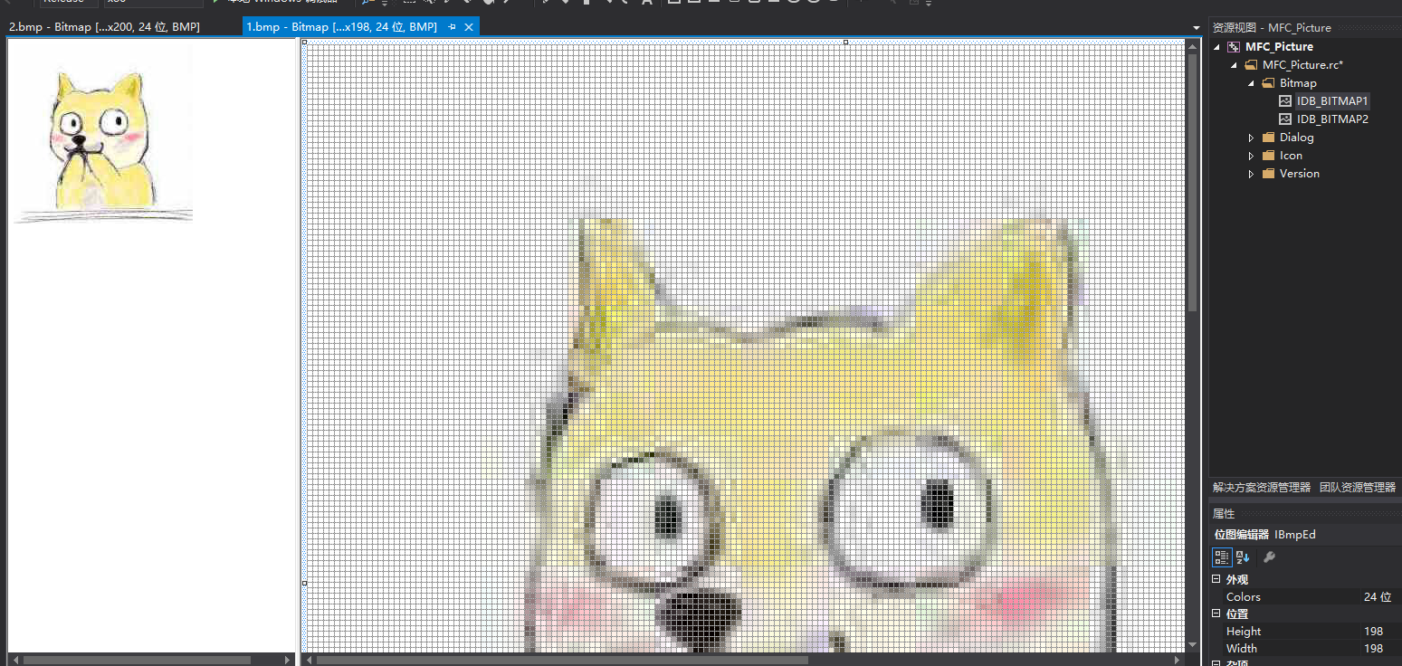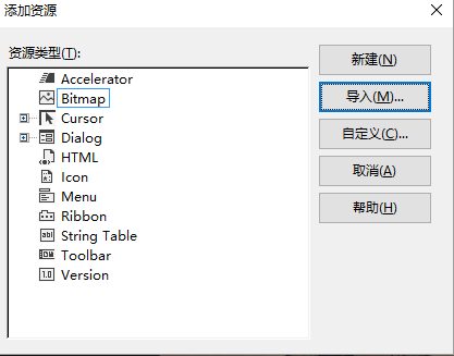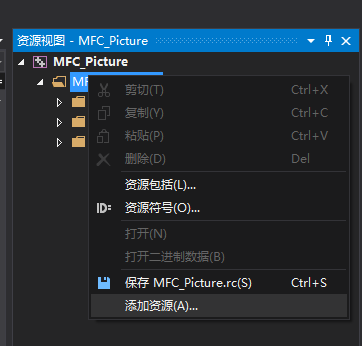 右击MFC_Picture.rc选择添加资源,把需要添加显示的BMP图片文件添加到资源,本文为了滚动显示两张图片,所以只用了两张BMP,当然你也可以三张四张无数张,在待会提及的代码部分进行修改即可。