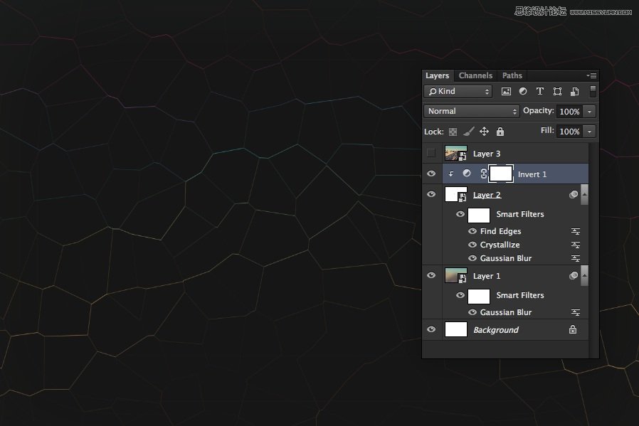 还是第二个图层,单击滤镜 > 像素化 > 晶格化,大小还是250 px,接着单击滤镜 > 风格化 > 查找边缘。