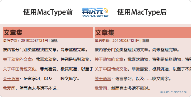MacType 与各种字体的搭配、显示效果的配置可以说是千变万化,而且效果差异也非常大,你可以省心地用默认配置,也可以花时间配置出独具一格的字体效果。如果大家有兴趣,我们下次可以推荐一下字体和配置文件的下载。如果你对MacType有所研究,也欢迎你将你认为最完美的配置共享给大家以便参考。
