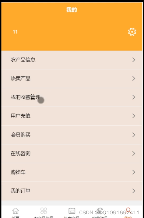 (b) 用户:进入系统可以实现首页、农产品信息、热卖产品、农业资讯我的等功能进行操作