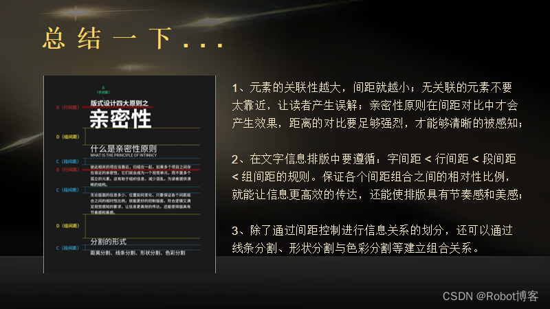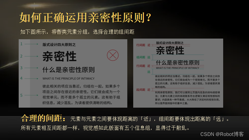 1、元素的关联性越大,间距就越小;无关联的元素不要太靠近,让读者产生误解;亲密性原则在间距对比中才会产生效果,距离的对比要足够强烈,才能够清晰的被感知;
