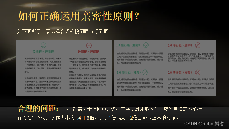 话不多说,老规矩,我们直接上图,对于亲密性而言,第一点,一定要选择合理的段间距与行间距。一般而言段间距需要大于行间距,这样文字信息才能区分开成为单独的段落行行间距推荐使用字体大小的1.4-1.6倍,小于1倍或大于2倍会影响正常的阅读。