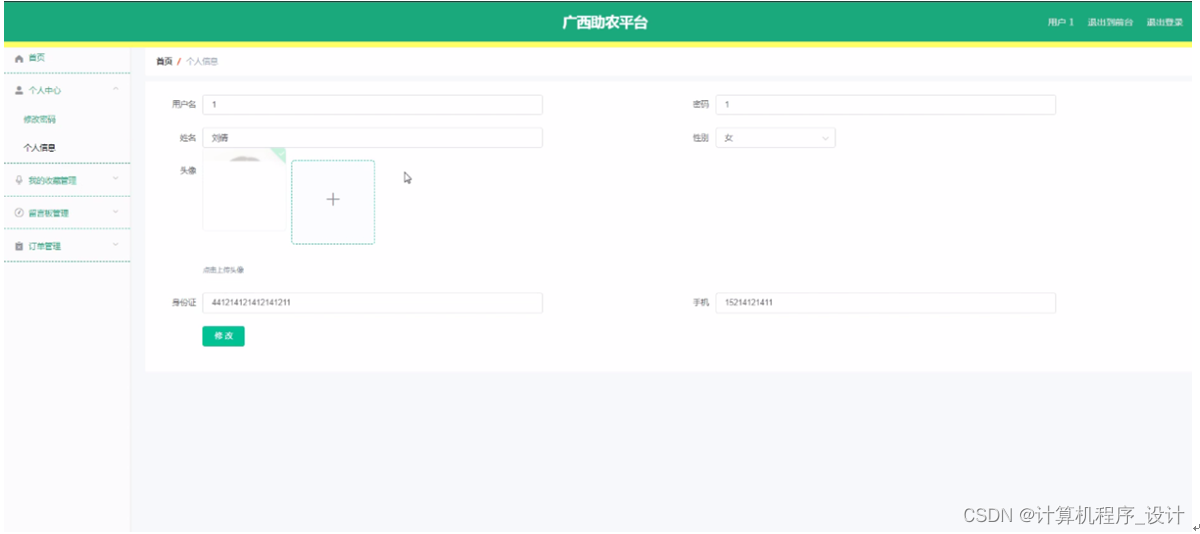 个人中心,在个人中心页面可以查看用户名、密码、姓名、性别、头像、身份证、手机等内容,并可根据需要对个人信息进行修改,如图5-12所示。
