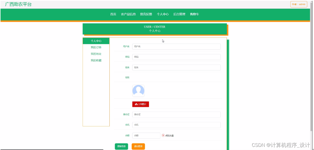 个人中心,在个人中心页面可以填写用户名、密码、姓名、性别、图片、身份证、手机、余额等信息进行信息更新,并根据需要对我的订单、我的地址、我的收藏进行相应操作,如图5-4所示。