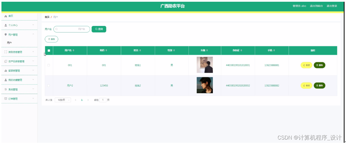 用户管理,在用户管理页面可以查看用户名、密码、姓名、性别、头像、身份证、手机等信息,并可根据需要进行删除,修改等操作,如图5-7所示。