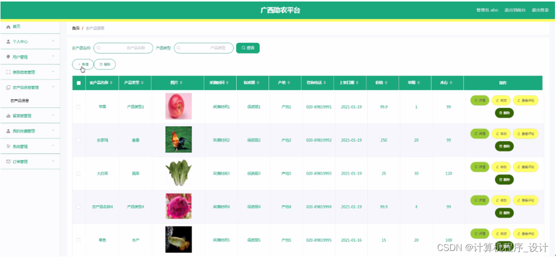 农产品信息管理,在农产品信息管理页面可以查看农产品名称、产品类型、图片、采够时间、保质期、产地、咨询电话、上架日期、价格、单限、库存等信息,并可根据需要进行详情、修改、查看评论或删除等操作,如图5-9所示。