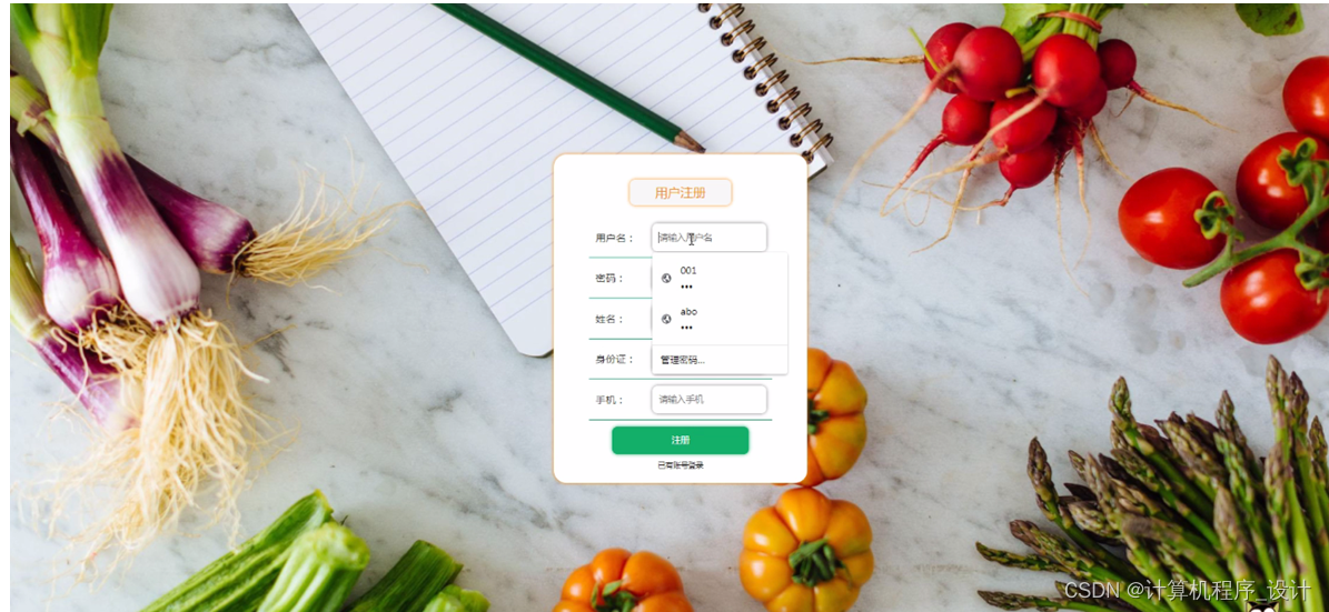 用户注册,在用户注册页面可以填写用户名、密码、姓名、身份证、手机等详细信息进行注册,如图5-2所示。